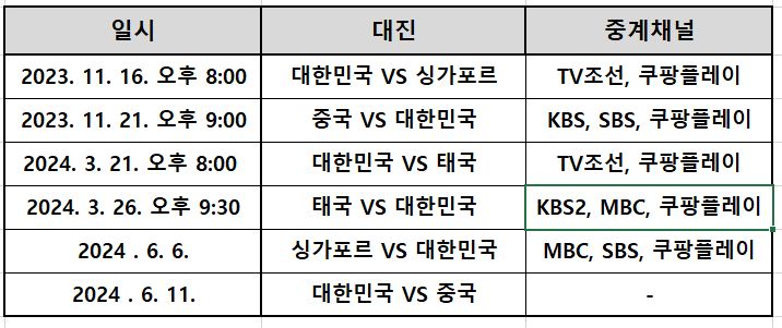 월드컵 아시아 예선전은 중계채널이 각 경기마다 다르오니 아래 표를 참고하시어 시청에 혼선이 없으시길 바라겠습니다.